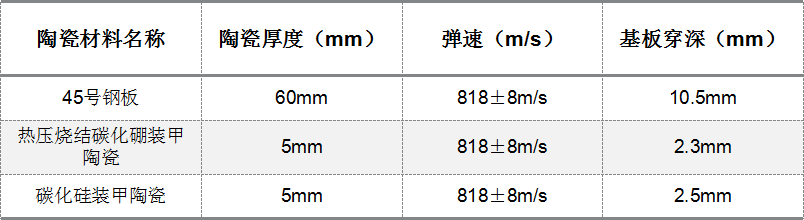 測(cè)試中,采用空白靶最對(duì)比,85式7.62毫米狙擊步槍對(duì)45號(hào)鋼的垂直侵徹深度為10.5mm,以此作為陶瓷復(fù)合裝甲的抗彈性能評(píng)判標(biāo)準(zhǔn)。對(duì)熱壓碳化硼裝甲片、碳化硅裝甲片進(jìn)行抗彈性能進(jìn)行評(píng)估。