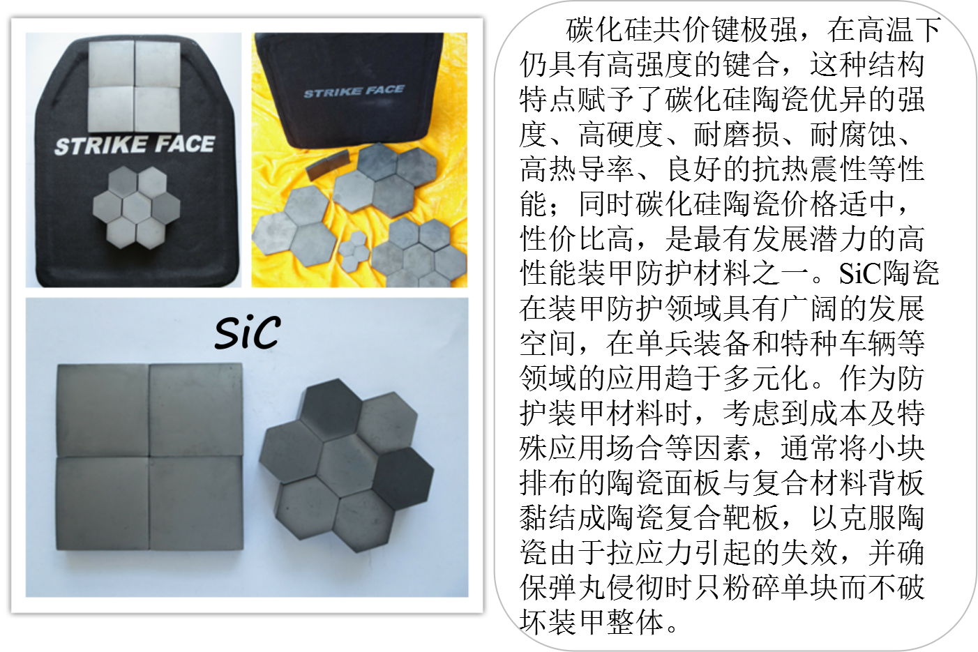 陶瓷材料擁有許多極具吸引力的性能,包括高比剛度、高比強度和在許多環(huán)境下的化學(xué)惰性。同時,因其相對于金屬的低密度、高硬度和高抗壓強度,使其在裝甲系統(tǒng)上的應(yīng)用十分具有吸引力,己成為一種廣泛應(yīng)用于防彈衣、車輛和飛機等裝備的防護裝甲。