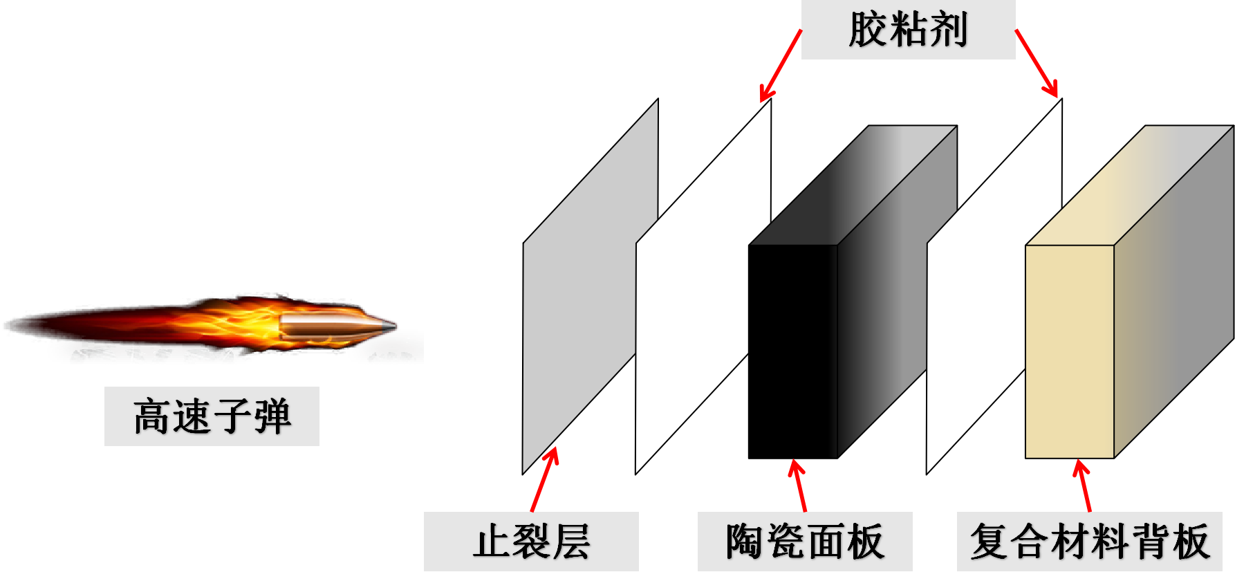 大多數(shù)復合陶瓷裝甲都是采用結(jié)構(gòu)陶瓷靶面+金屬/非金屬背靶結(jié)構(gòu),如下圖所示: