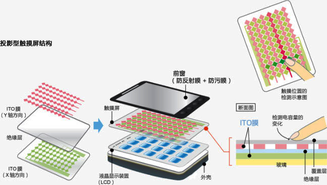 有IPHONE引領(lǐng)的投射電容觸摸屏采用多層ITO層,形成矩陣式分布,以X軸、Y軸交叉分布做為電容矩陣,當(dāng)手指觸碰屏幕時(shí),可通過X、Y軸的掃描,檢測(cè)到觸碰位置電容的變化,進(jìn)而計(jì)算出手指之所在?;诖朔N架構(gòu),投射電容可以做到多點(diǎn)觸控操作。