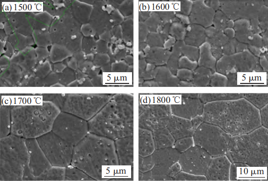 從圖中可以明顯看到,燒結(jié)溫度為1500時(shí),平均晶粒大小為3.34um,此時(shí)致密度較低,晶粒之間存在明顯的空隙,燒結(jié)效果并不理想;當(dāng)燒結(jié)溫度為1600時(shí),晶粒大小為3.74um,可以看出合金的晶粒大小并沒(méi)有明顯長(zhǎng)大,但是致密性卻有明顯的改善;當(dāng)燒結(jié)溫度為17001800時(shí),晶粒明顯長(zhǎng)大,約9.5um。