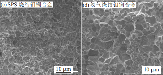 通過(guò)對(duì)SPS燒結(jié)(溫度1600、保溫7min)及氫氣保護(hù)燒結(jié)(1800,保溫6h)合金進(jìn)行抗拉強(qiáng)度和抗壓強(qiáng)度測(cè)試,發(fā)現(xiàn)采用SPS燒結(jié)的鉬鑭合金抗拉強(qiáng)度以及抗壓強(qiáng)度分別提升765MPa、2307MPa。對(duì)兩種試樣的斷口分析發(fā)現(xiàn)SPS燒結(jié)的合金晶粒大小更加均勻細(xì)小。